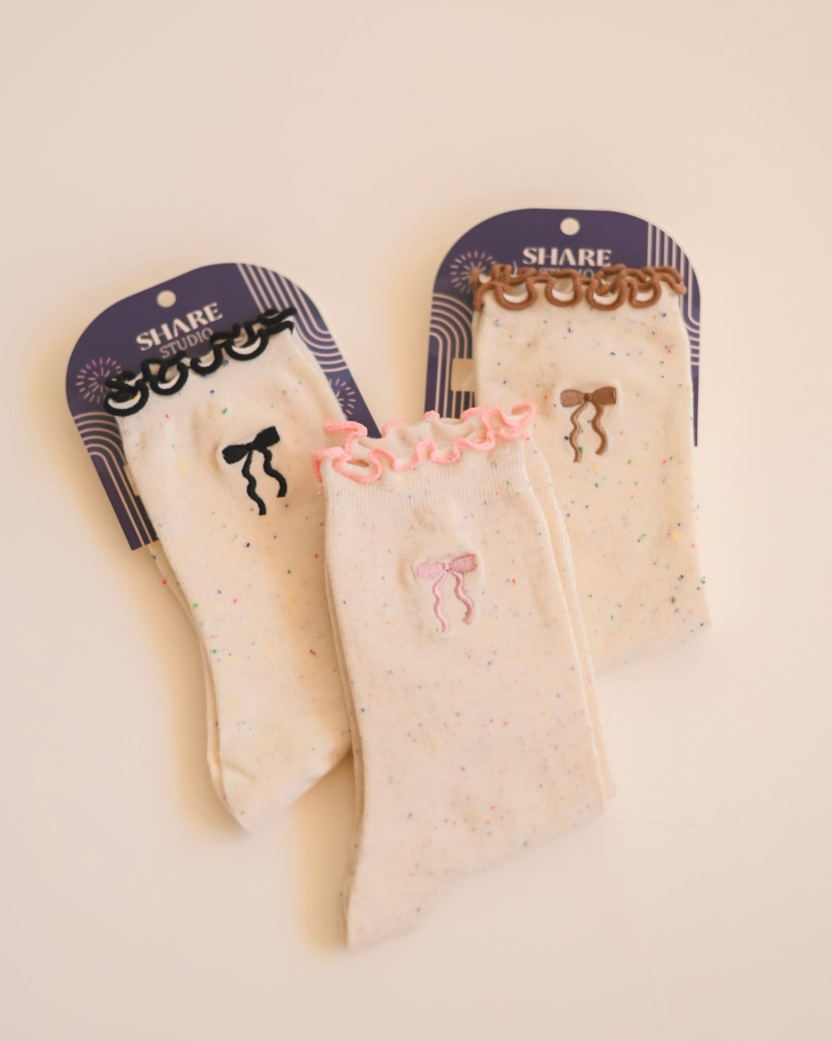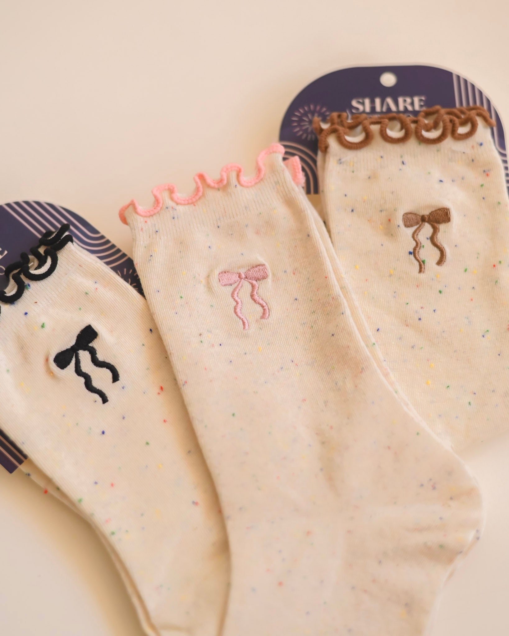 Our Coquette Socks are the perfect blend of comfort and charm — featuring a soft speckled knit, dainty scalloped trim, and a delicate embroidered bow for that feminine, coquette-inspired touch. With a comfortable stretch and just the right amount of ruffle, they’re the kind of socks that make every outfit feel a little more put together.