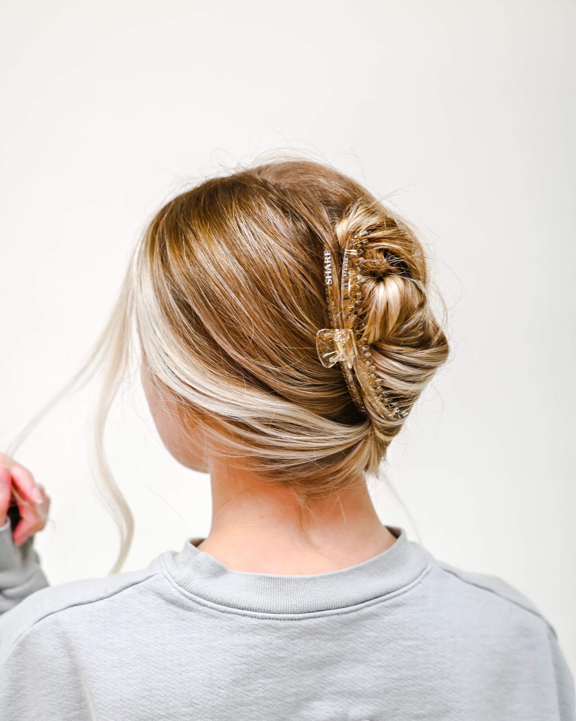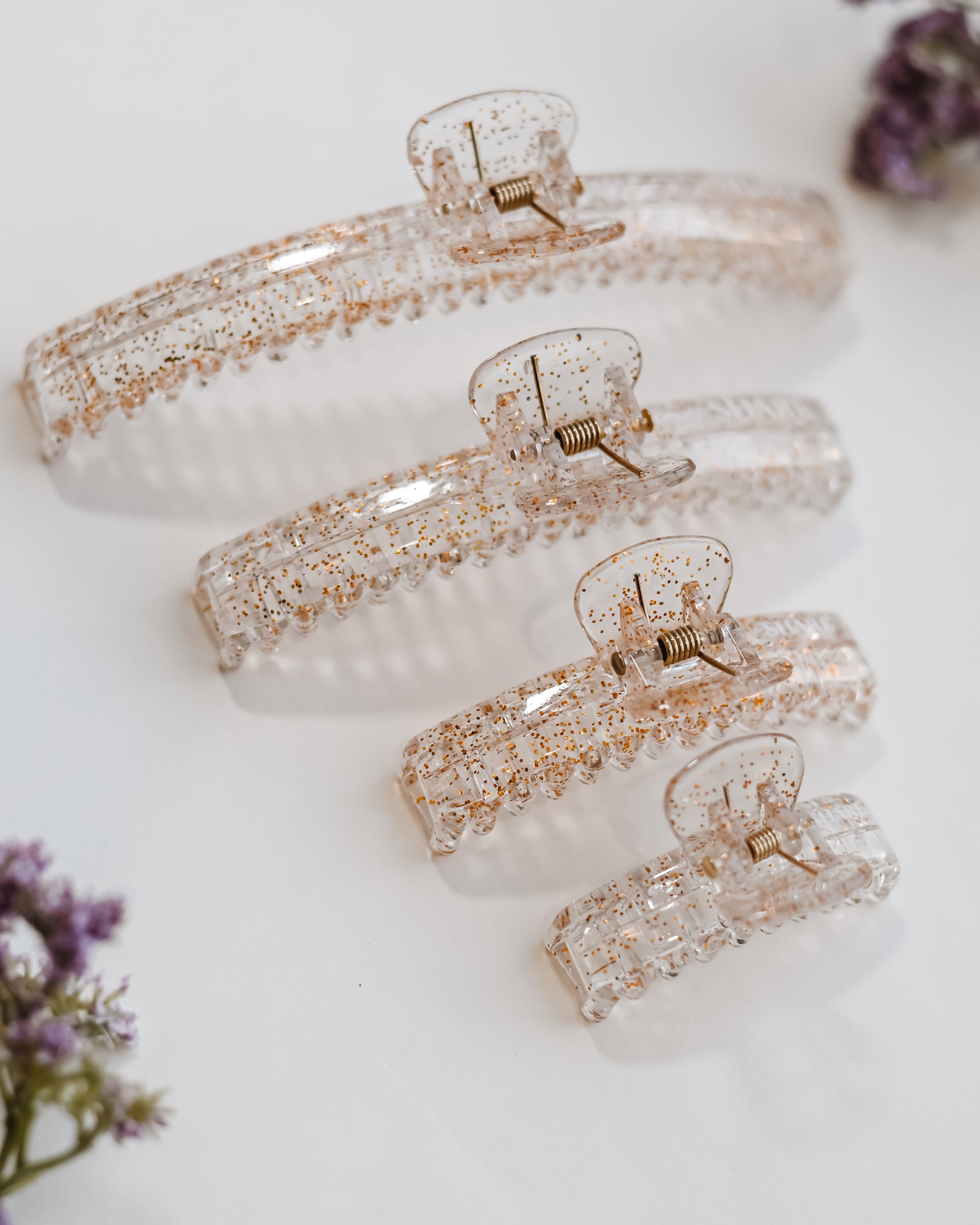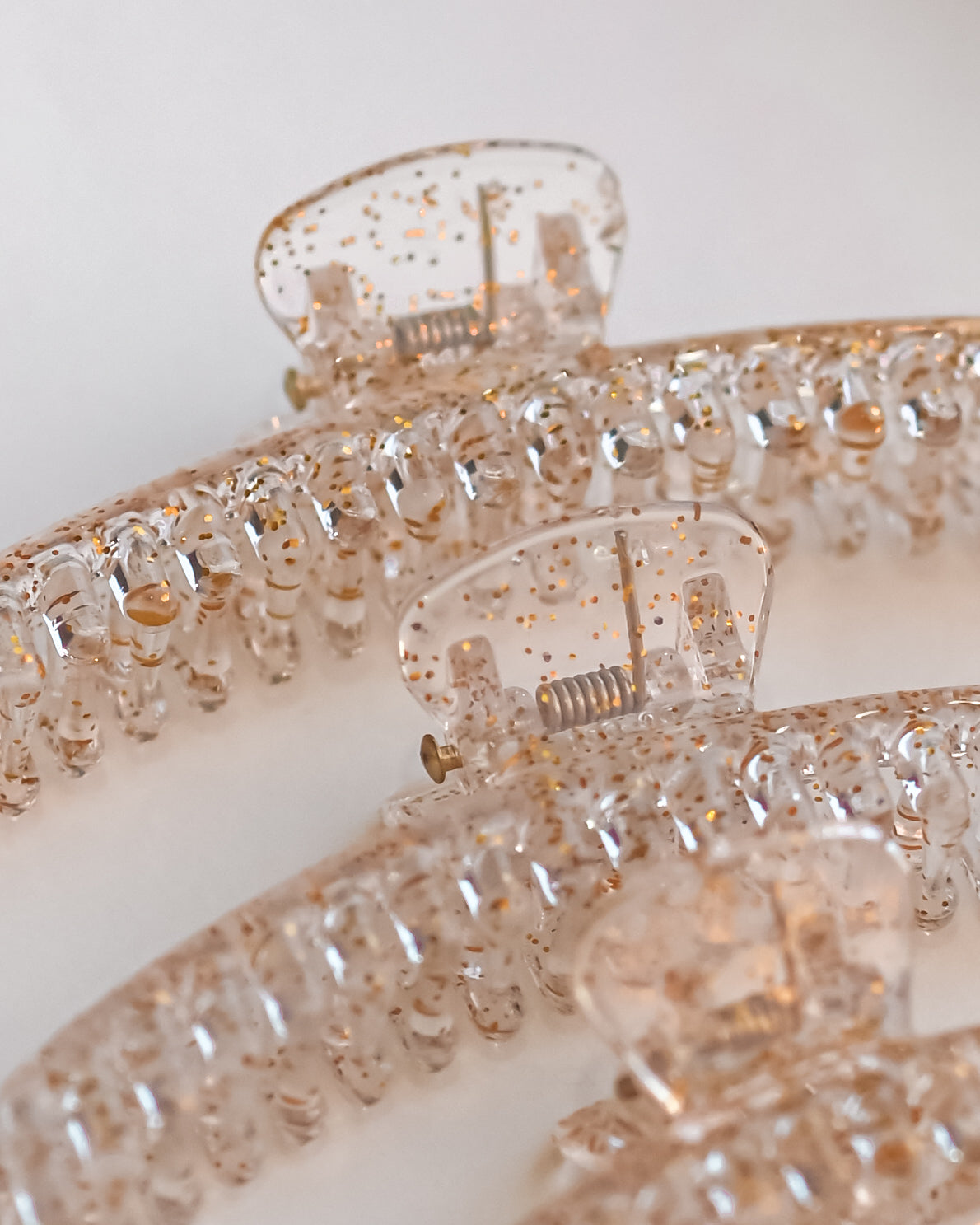 The Mega Hold Clip is a great go-to clip for every hair type, and works wonders at keeping hair in place all day long without causing damage. The structure and design of the Mega Hold allows for a comfortable fit through any activity, including laying down and driving! This clip is especially great for active occupations and hobbies. Our Golden Flakes Mega Hold has a glossy coat covering the clear mold, with built-in golden flakes all throughout for a glitter effect.