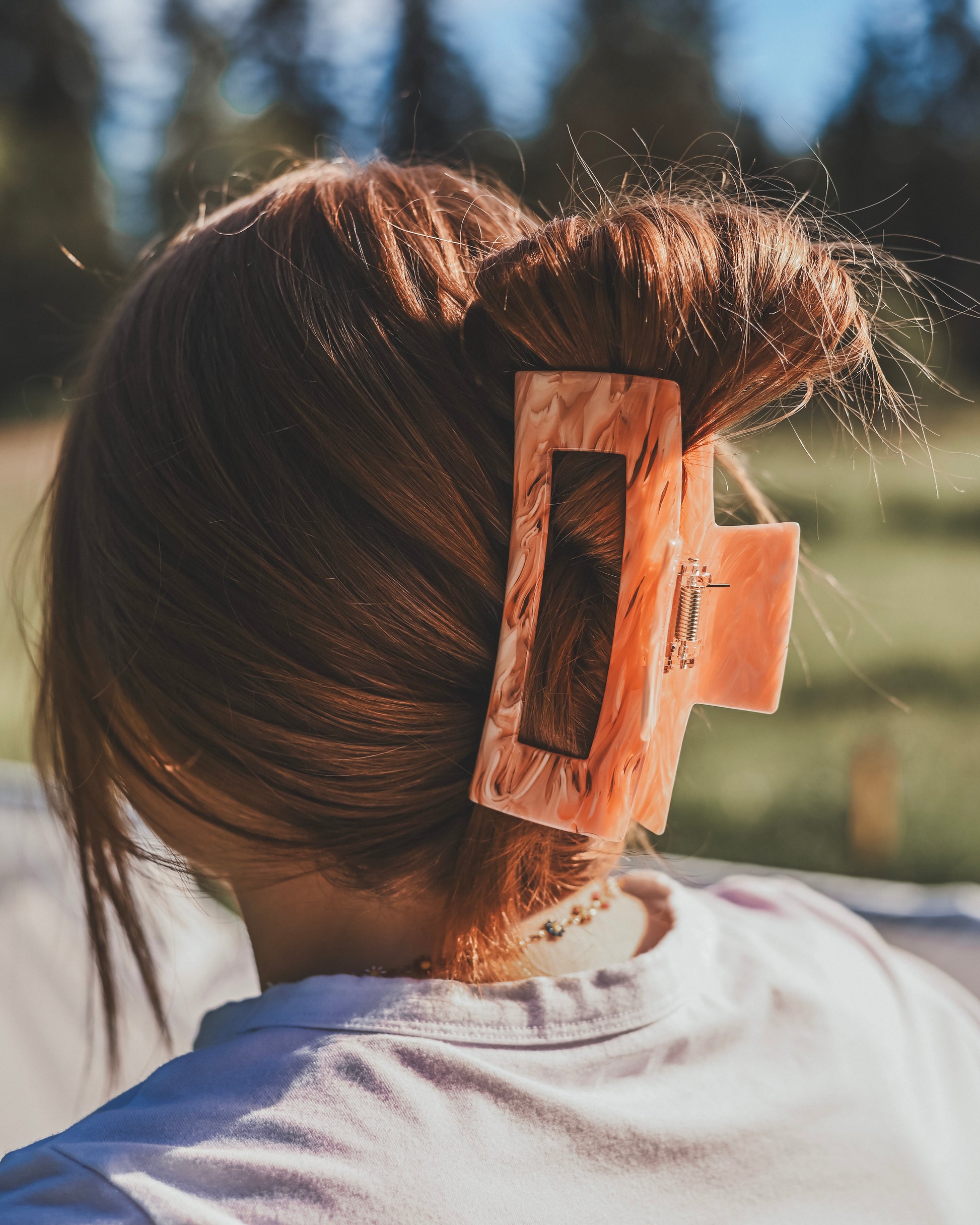 This clip has us just peachy, it's so stunning! Find comfort in our infamous jumbo acetate claw in a new gorgeous color pattern. Approximately 6 inches in length with ample areal room for hair, this clip is designed for the girlies with thick hair. Not only is this clip adorable, it's practical too! Featuring our cellulose acetate material, this clip is eco-friendly and much more durable than any plastic clip in your collection.