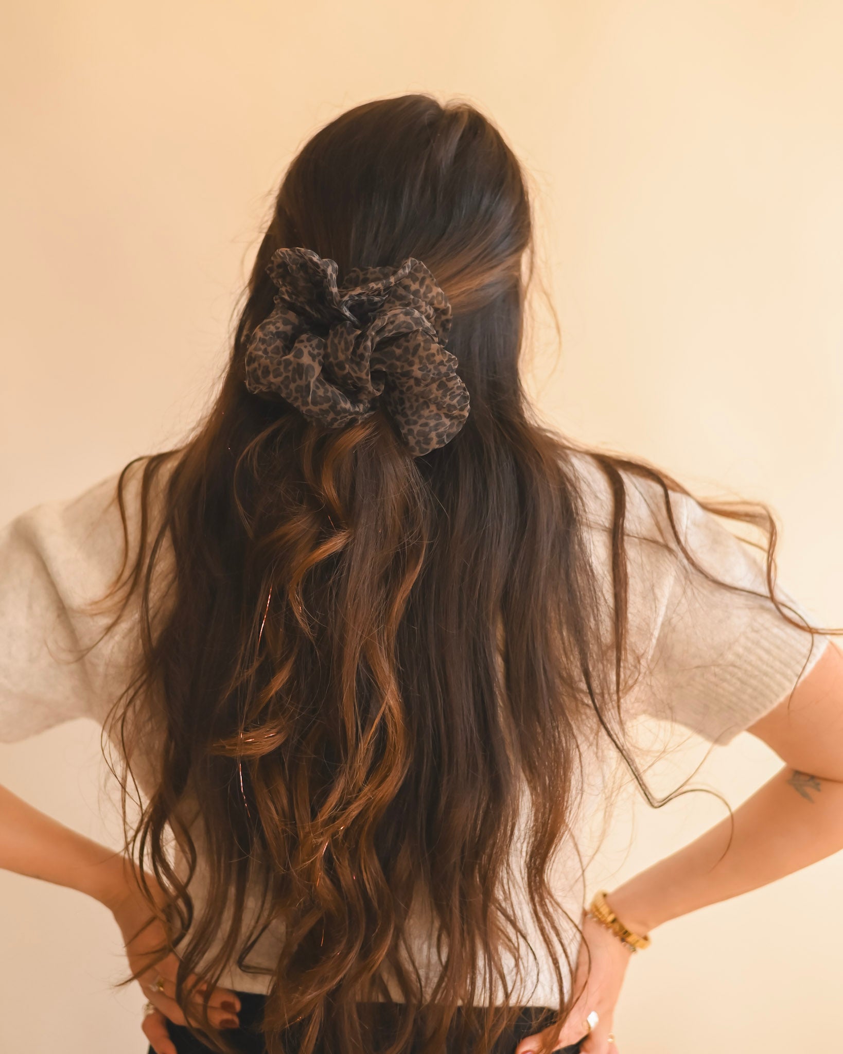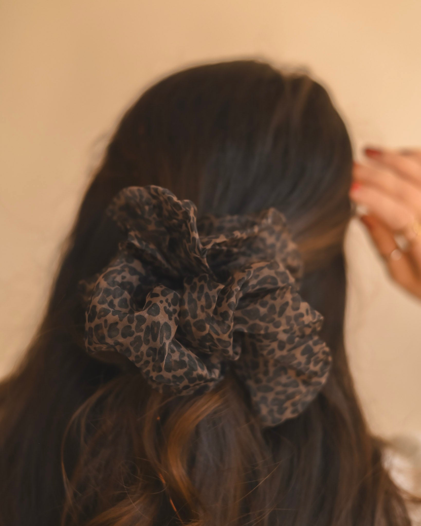 Bring a little edge to your everyday style with our Midnight Leopard XL Scrunchie. Made from a soft, sheer fabric that adds effortless volume, this oversized scrunchie blends a bold print with a lightweight, airy finish. It’s the perfect mix of wild and refined — whether you’re heading out for dinner or adding a subtle statement to your weekend look.